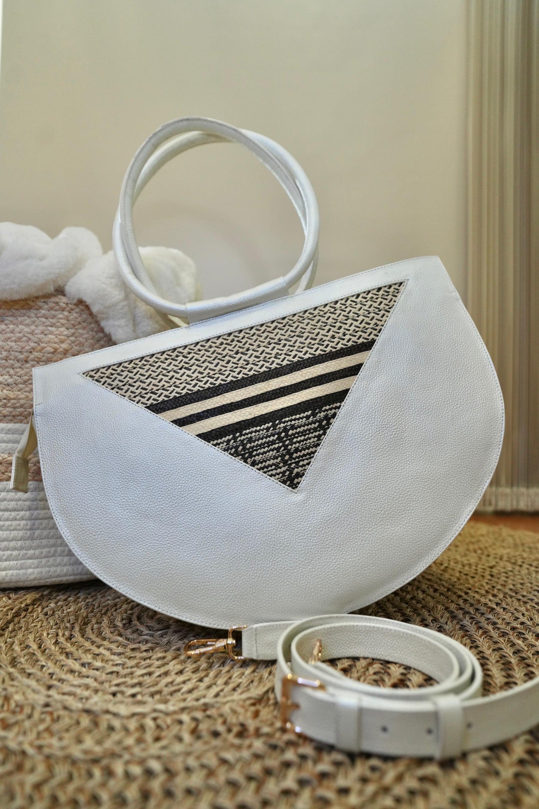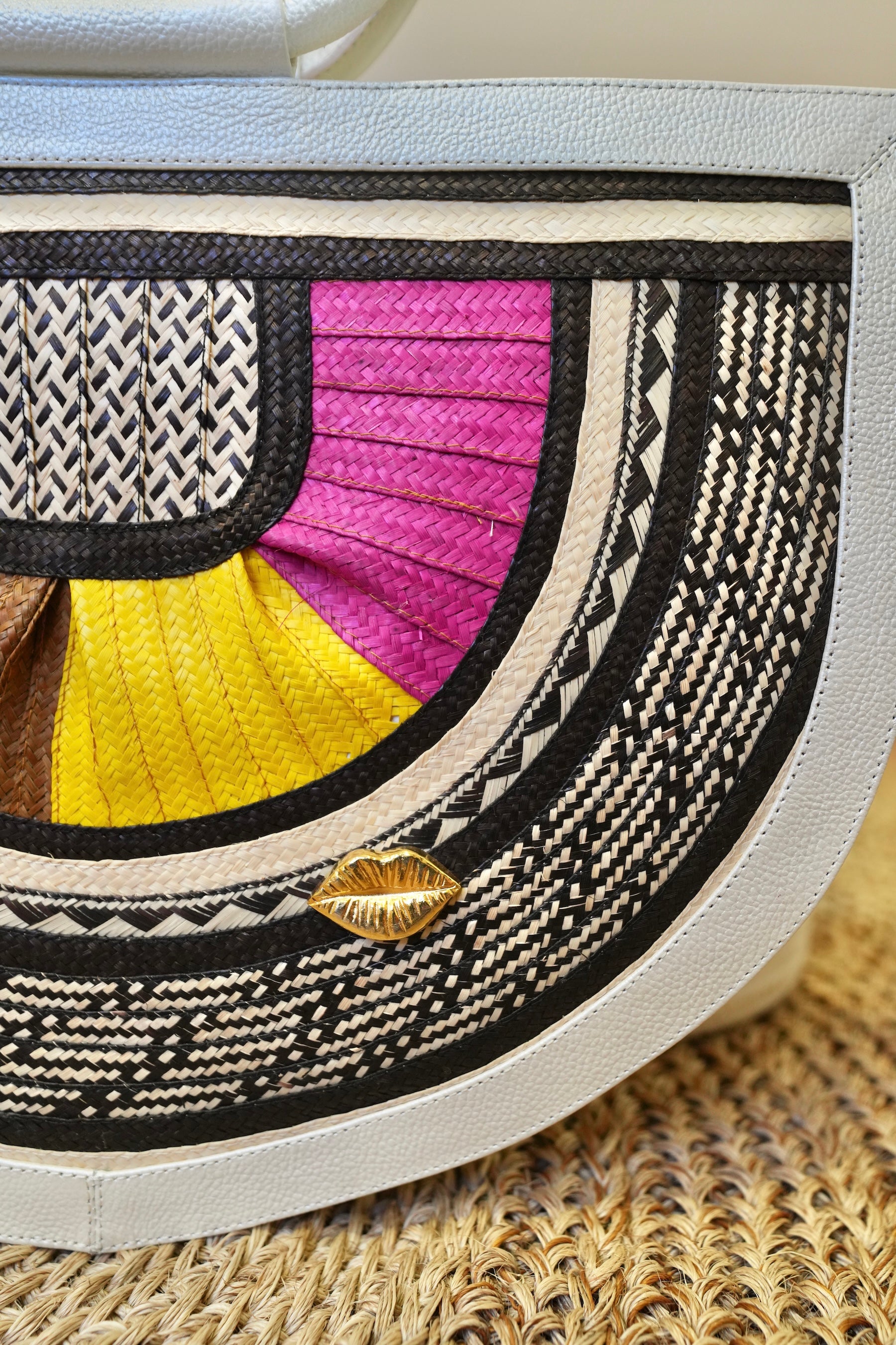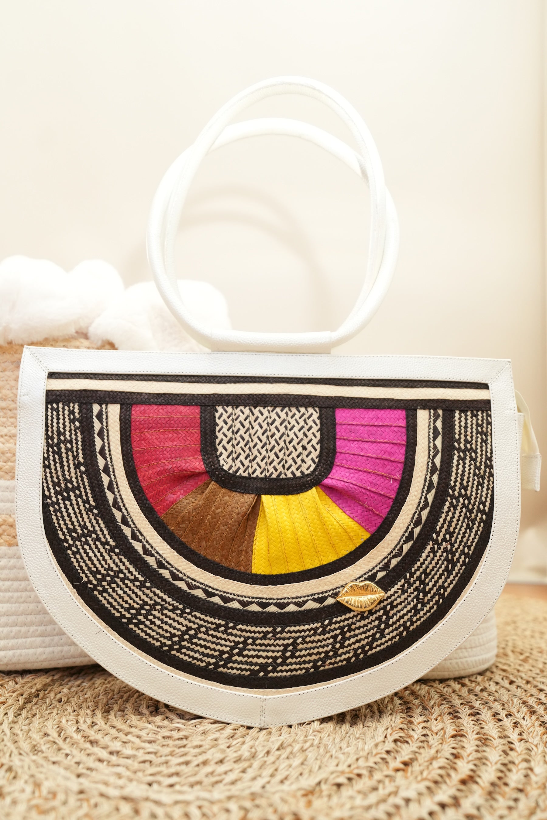 Its multicolor arc design, contrasted with black and white weaves, creates a sophisticated and vibrant composition. Framed by an ivory structure and finished with the iconic Bluelips kiss in gold hardware.