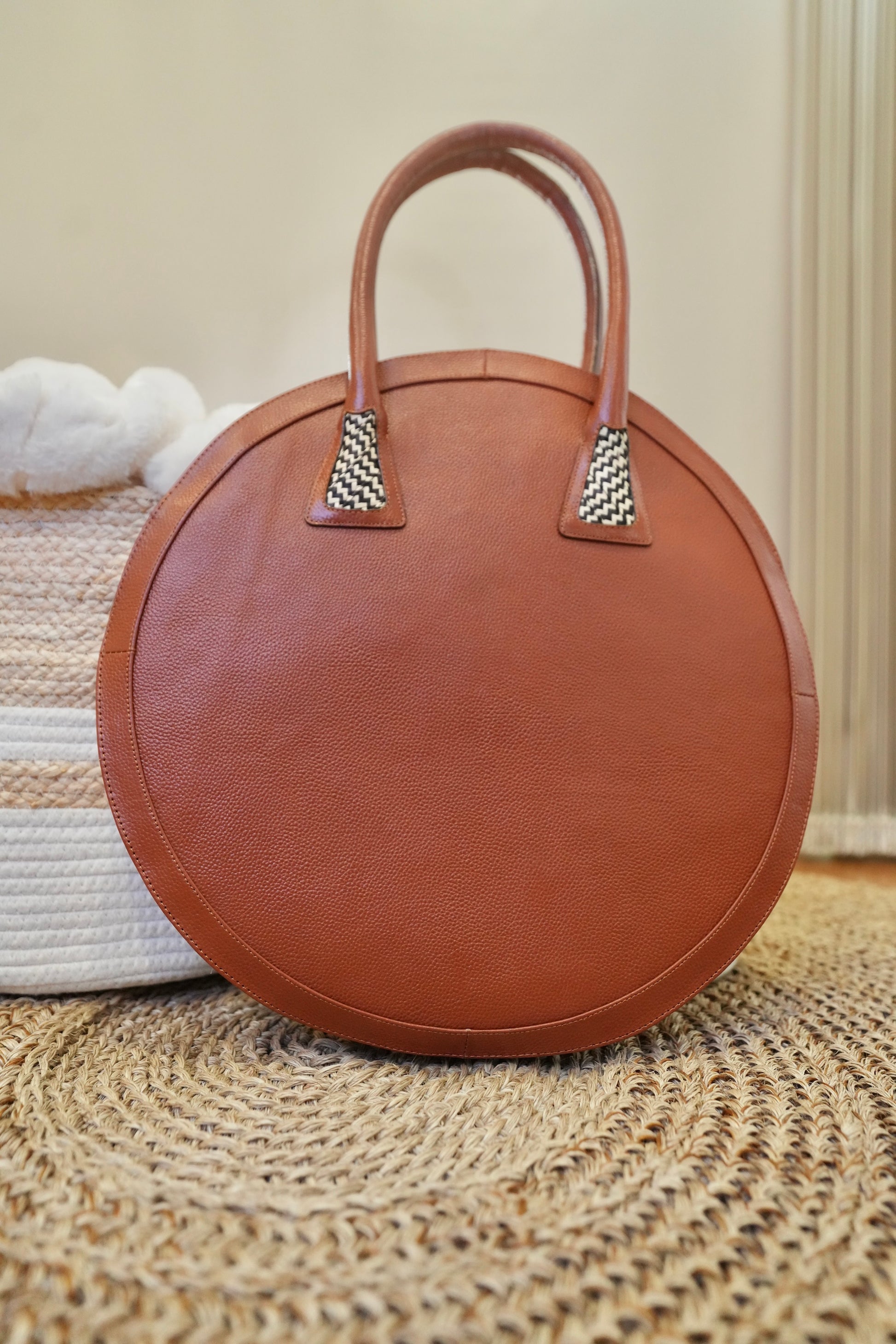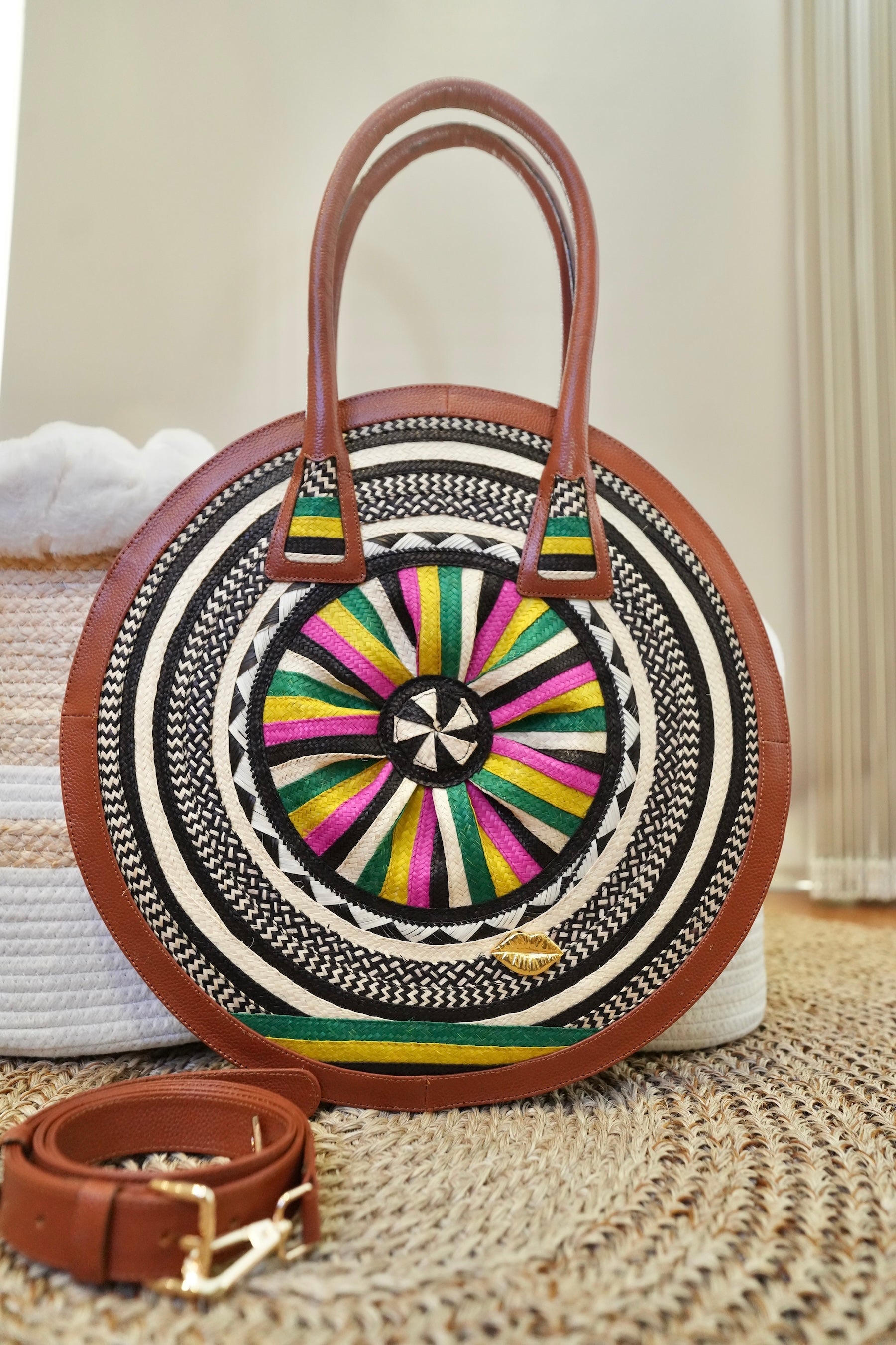 Large format, circular design, and an explosion of color that reflects the joy, rhythm, and energy of our coast. Crafted in premium leather and handcrafted caña flecha weaving, it blends tradition with contemporary sophistication.