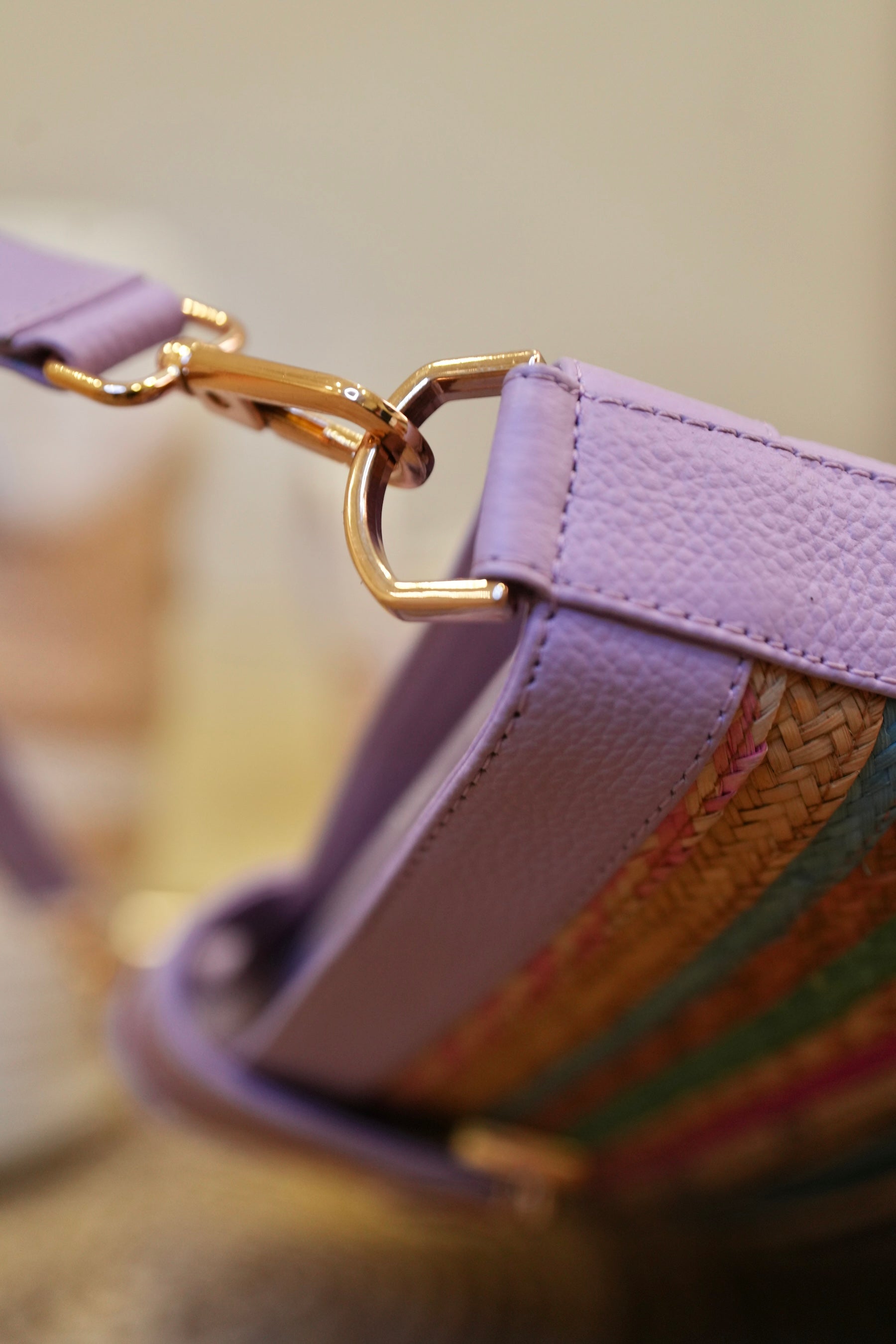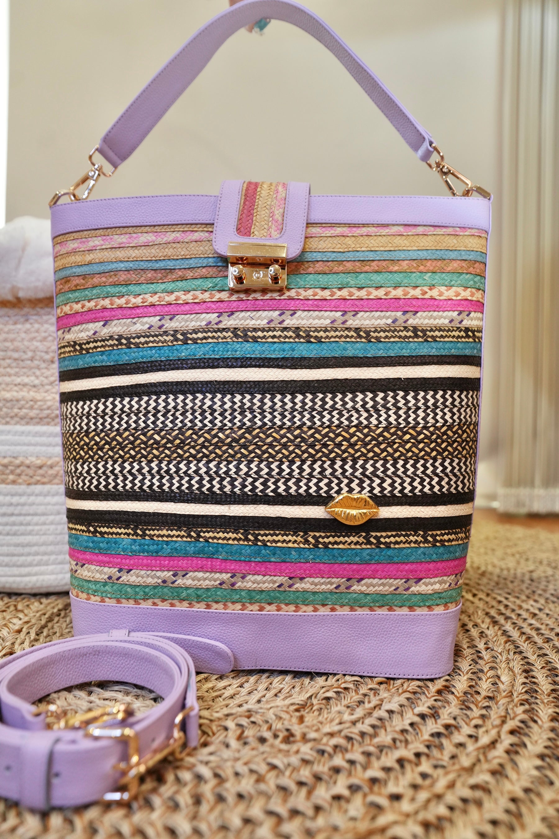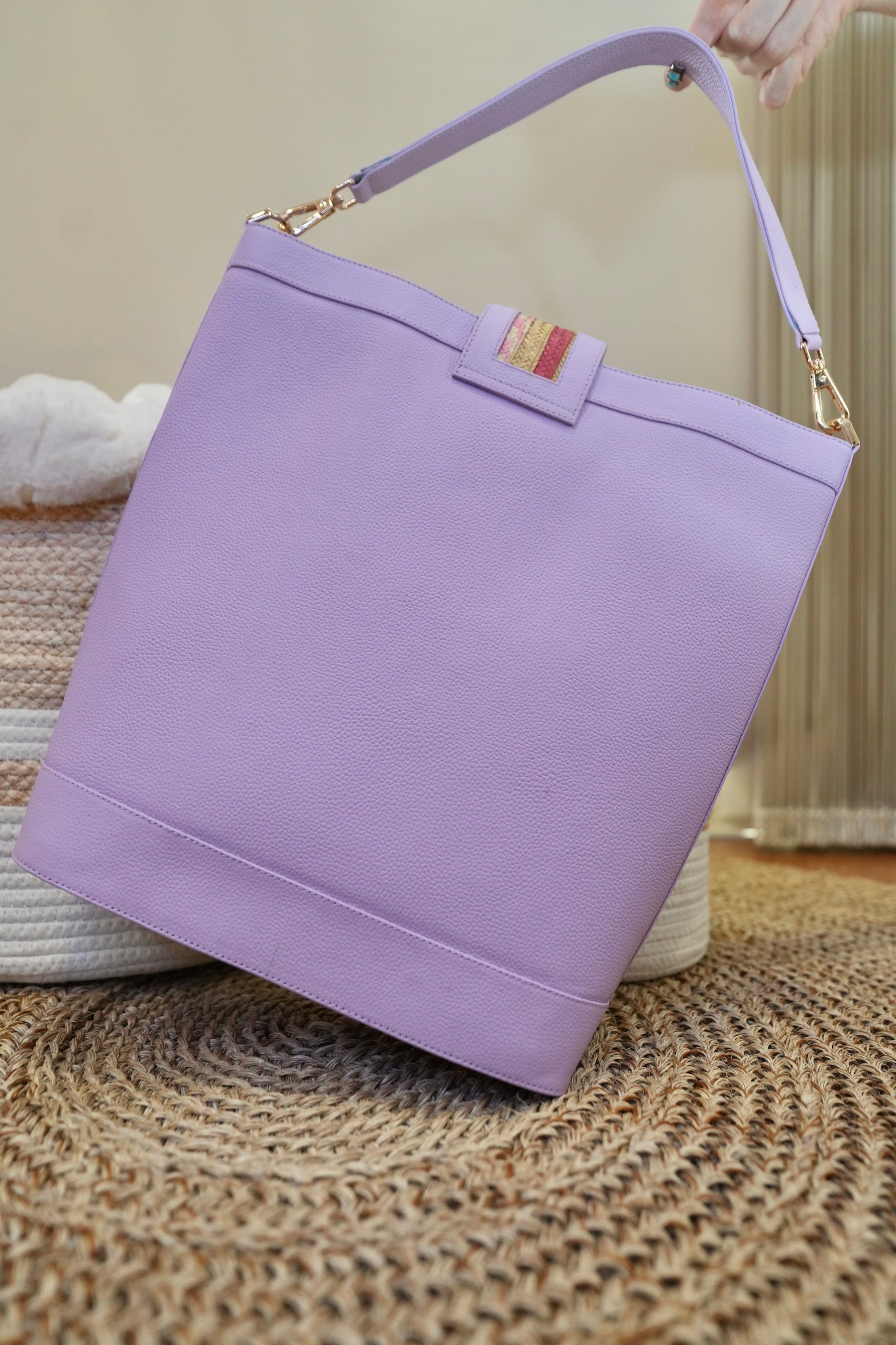 Handcrafted bucket-style handbag made from premium leather and natural caña flecha fiber. Its vibrant multicolor weave is framed by a soft lilac structure, creating a fresh yet sophisticated contrast.