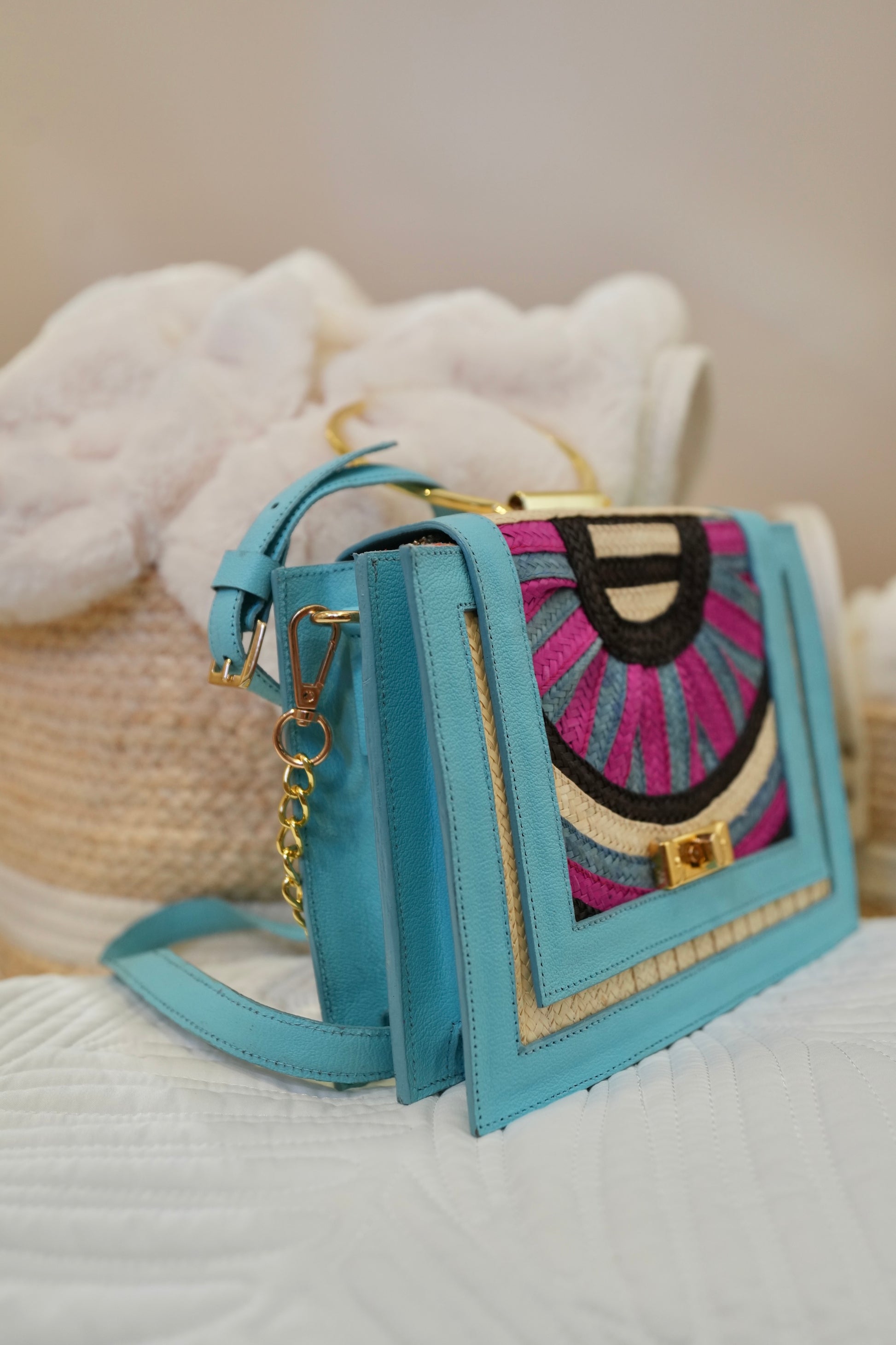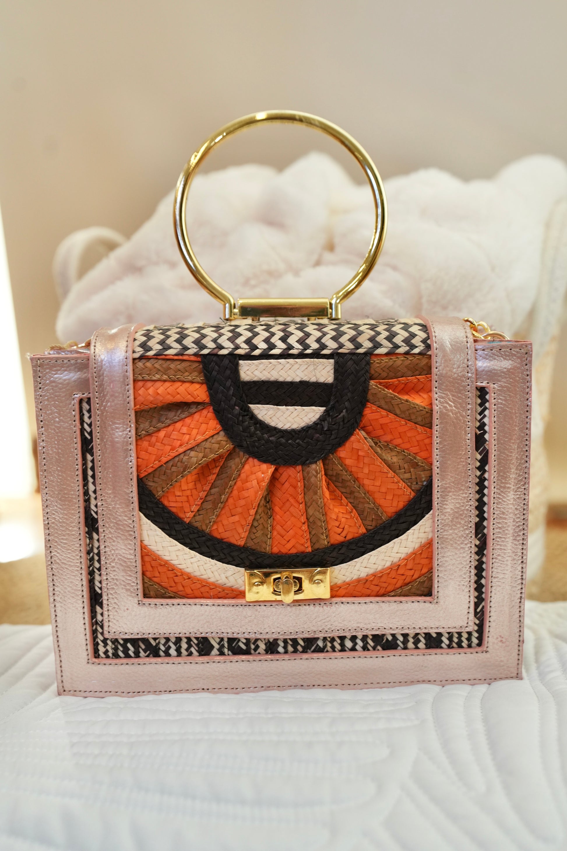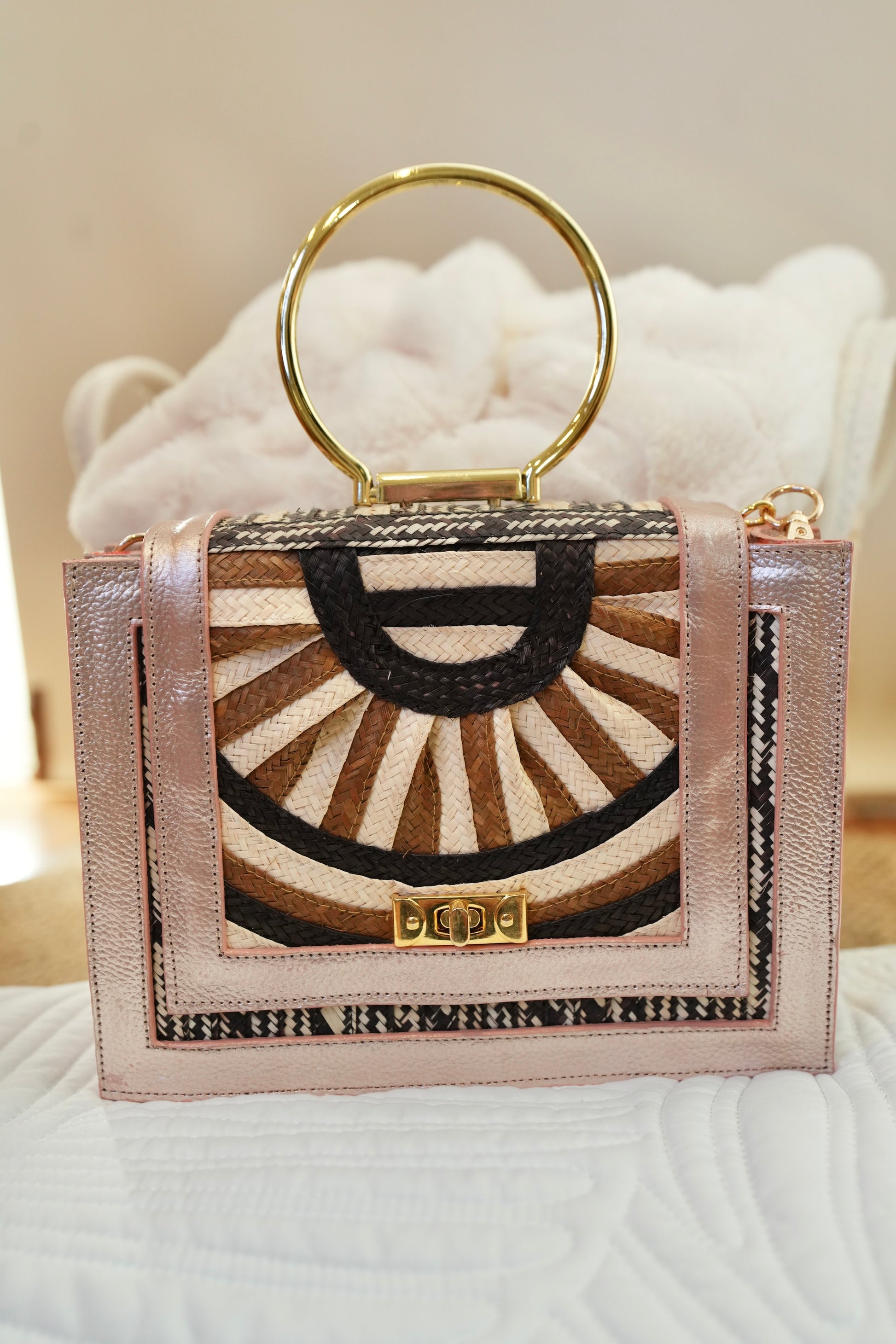 Esta cartera Bluelips destaca por su diseño geométrico en fibras naturales.