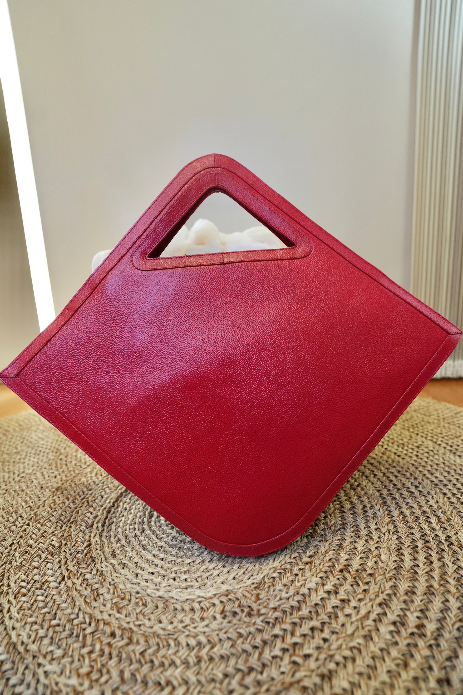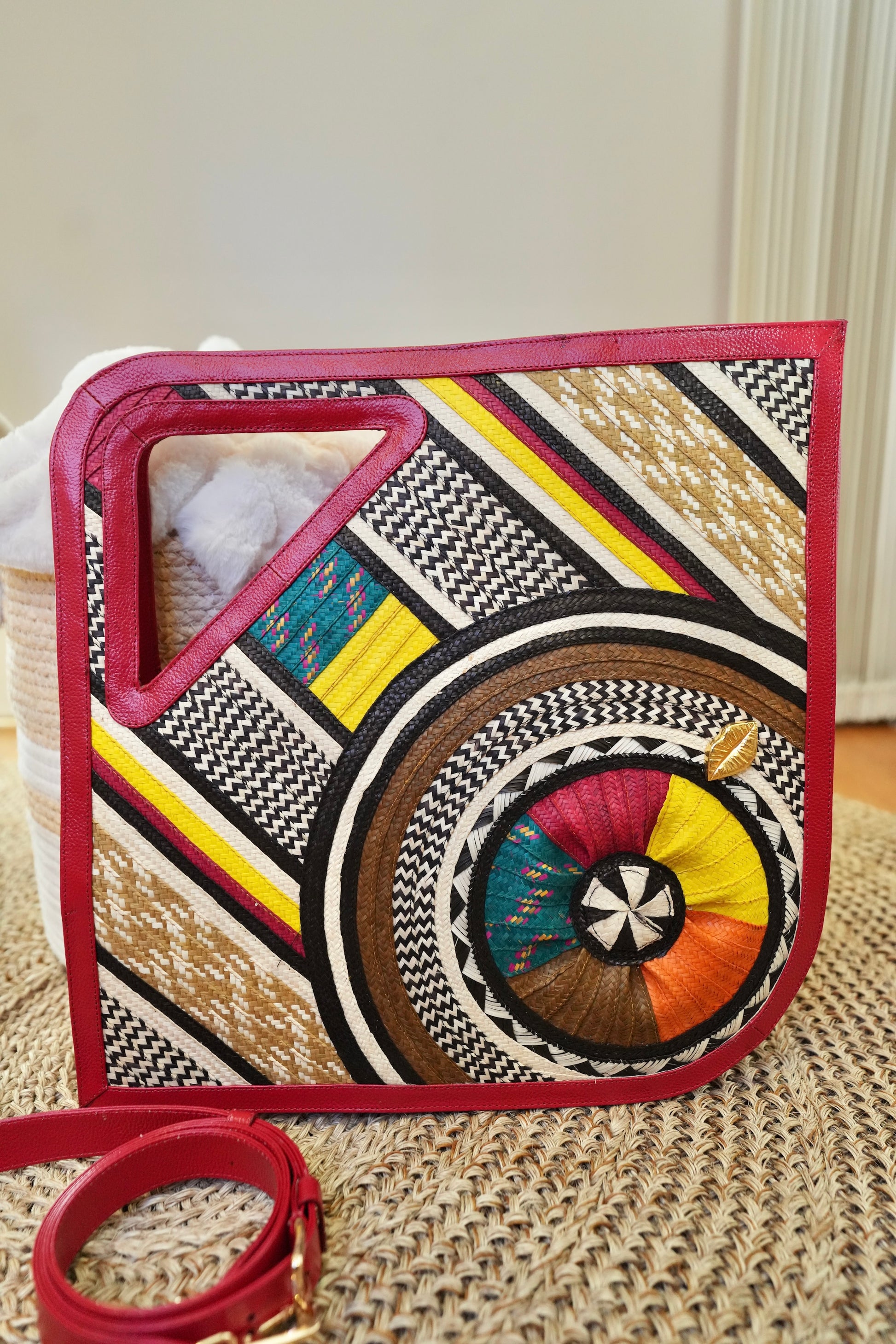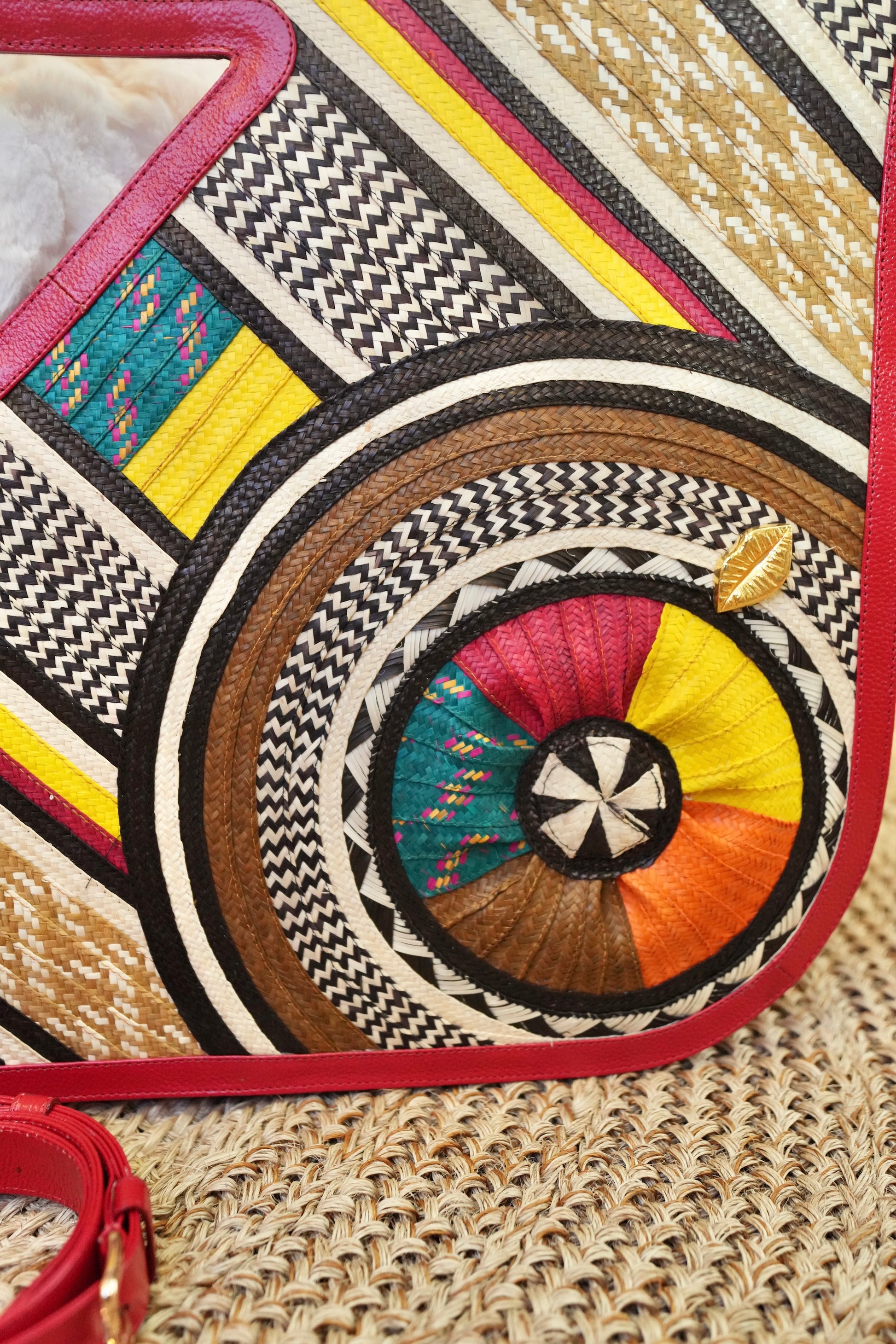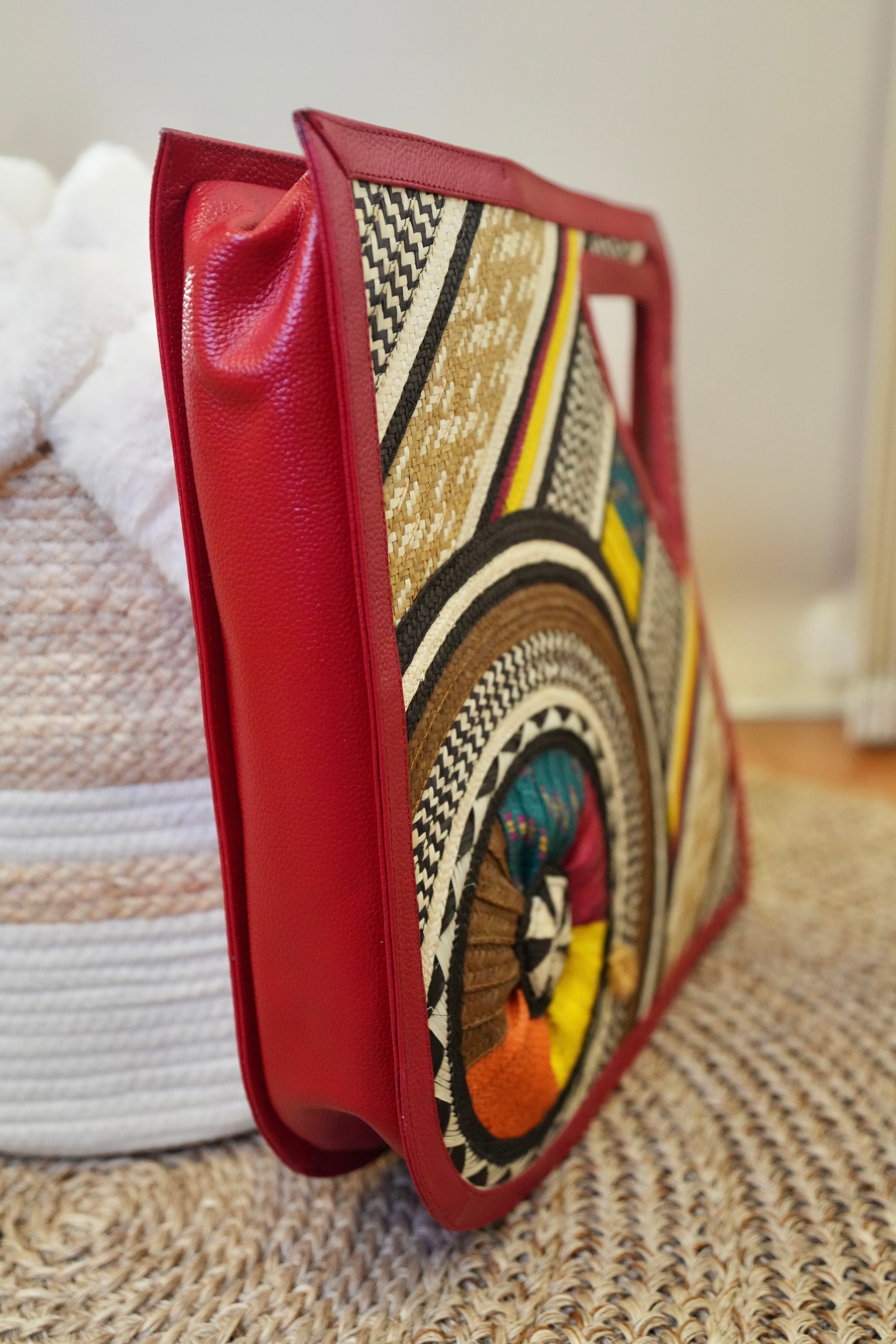Its geometric, multicolor design creates a unique artistic composition, framed by a red leather trim that highlights its bold character.