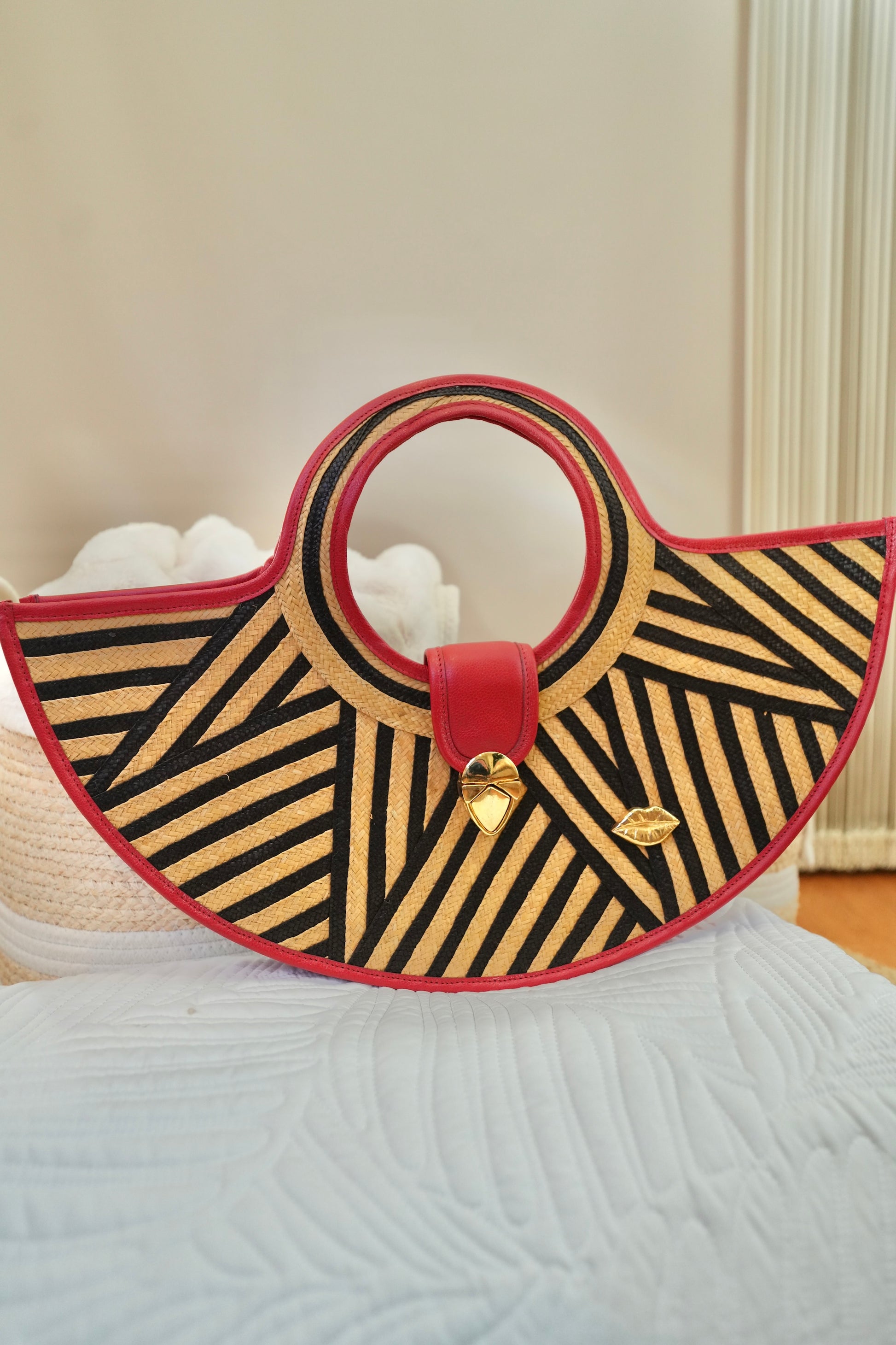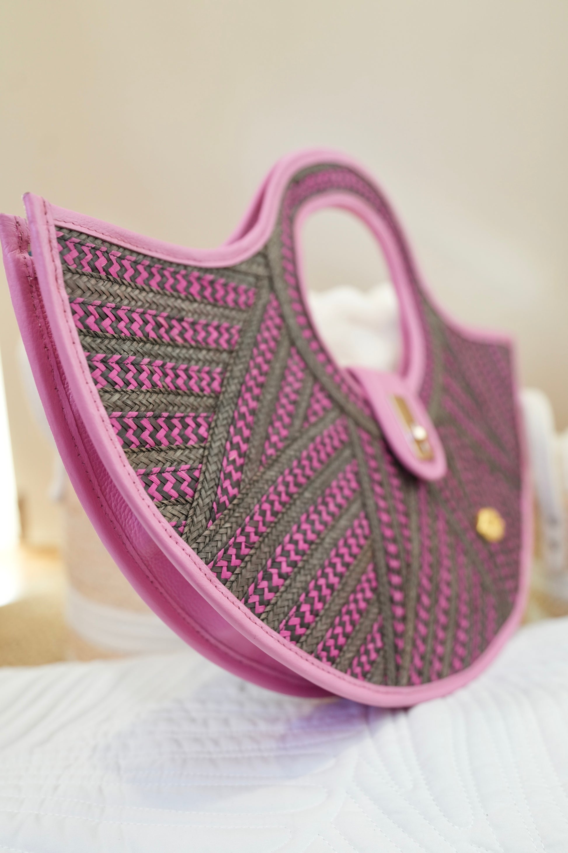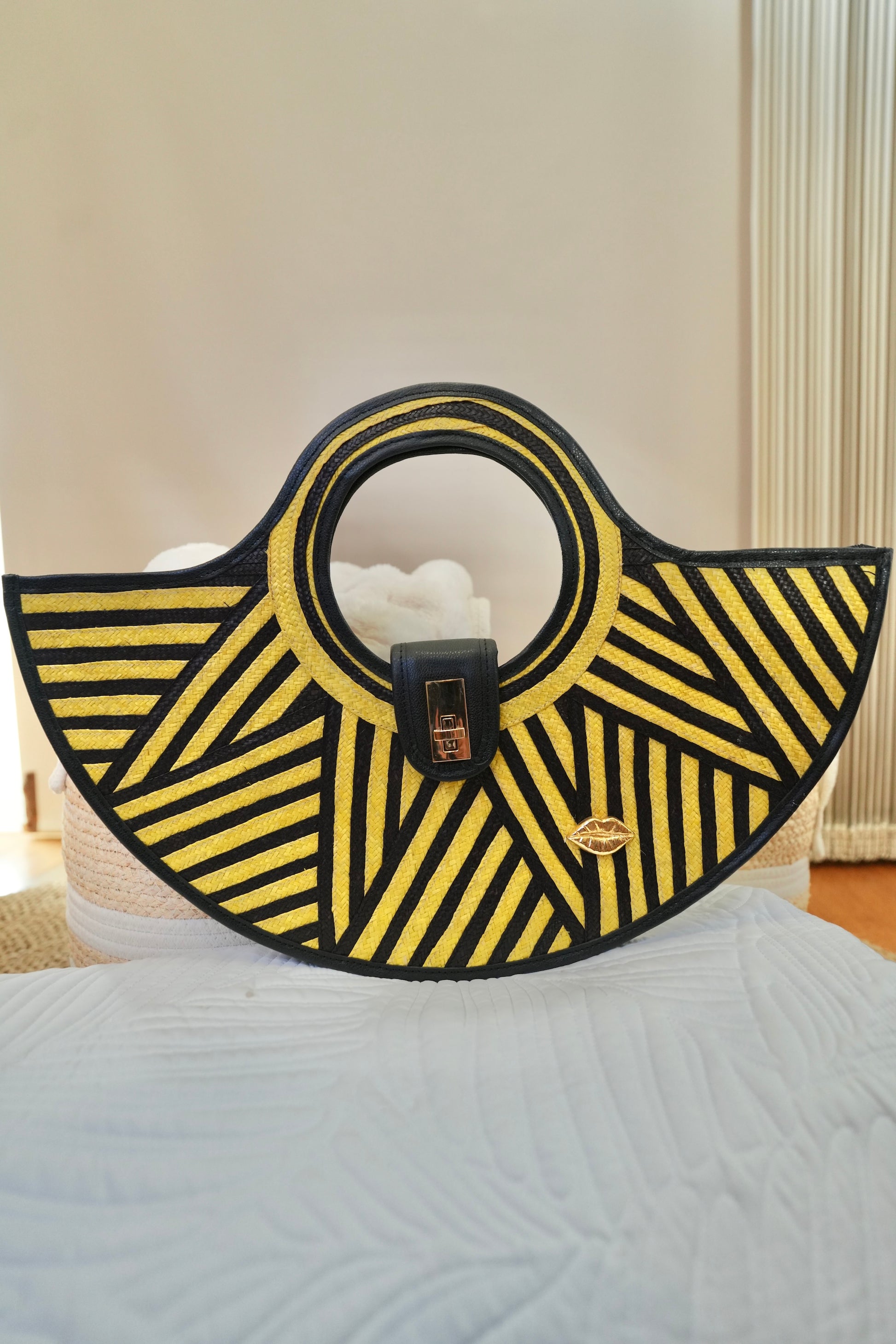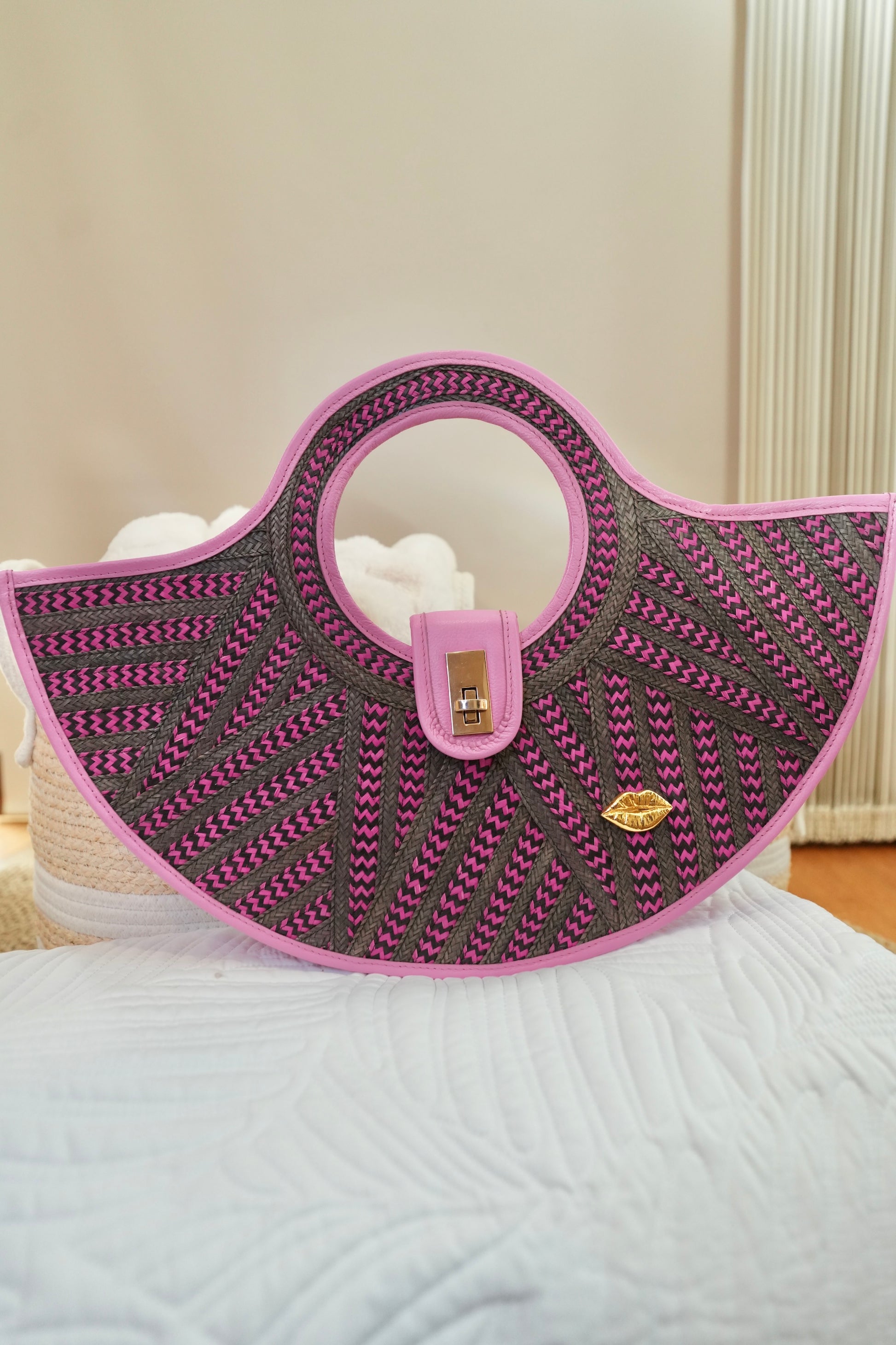 The geometric black and fuchsia contrast creates a modern, sophisticated visual effect, highlighted by gold hardware and the iconic Bluelips kiss.