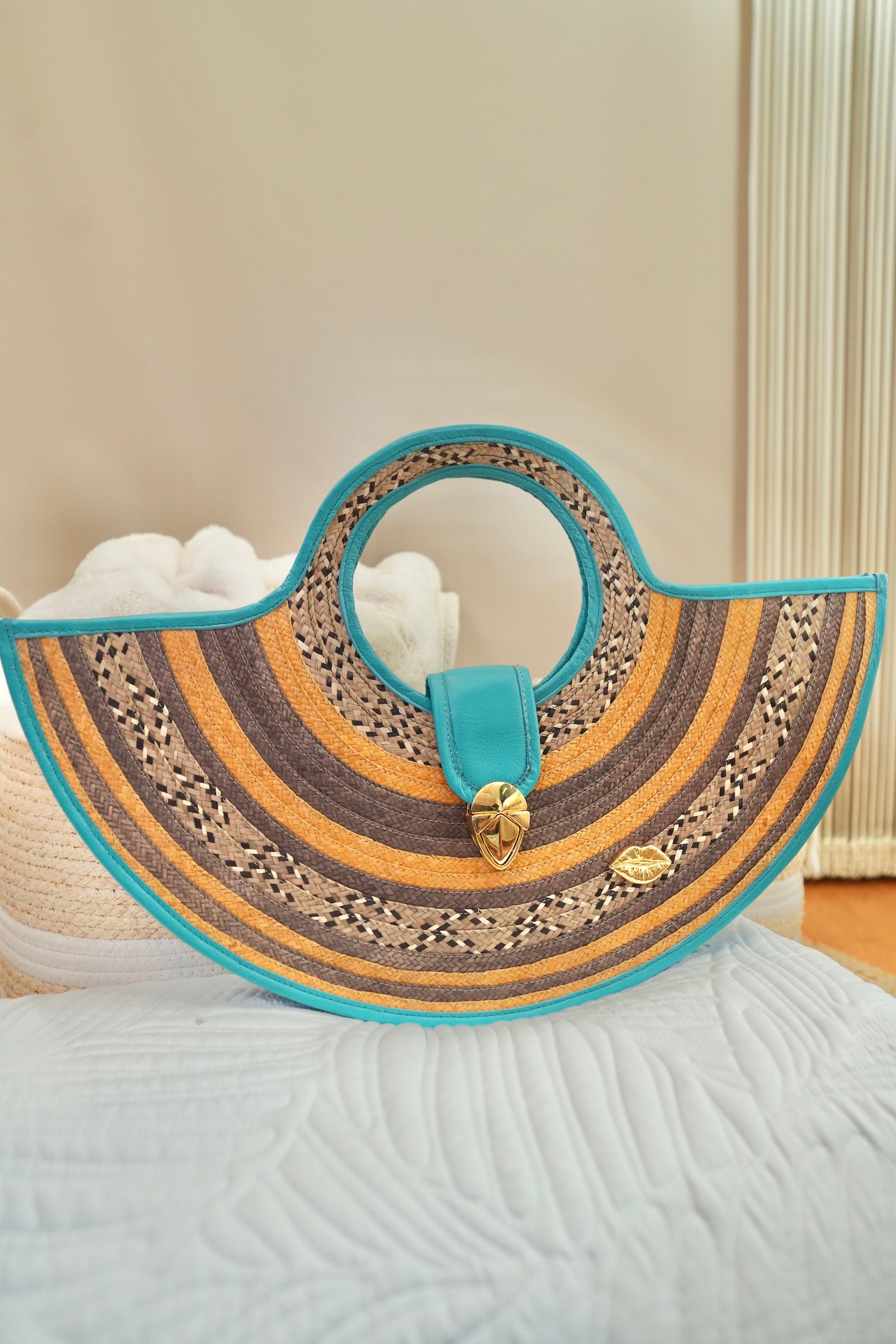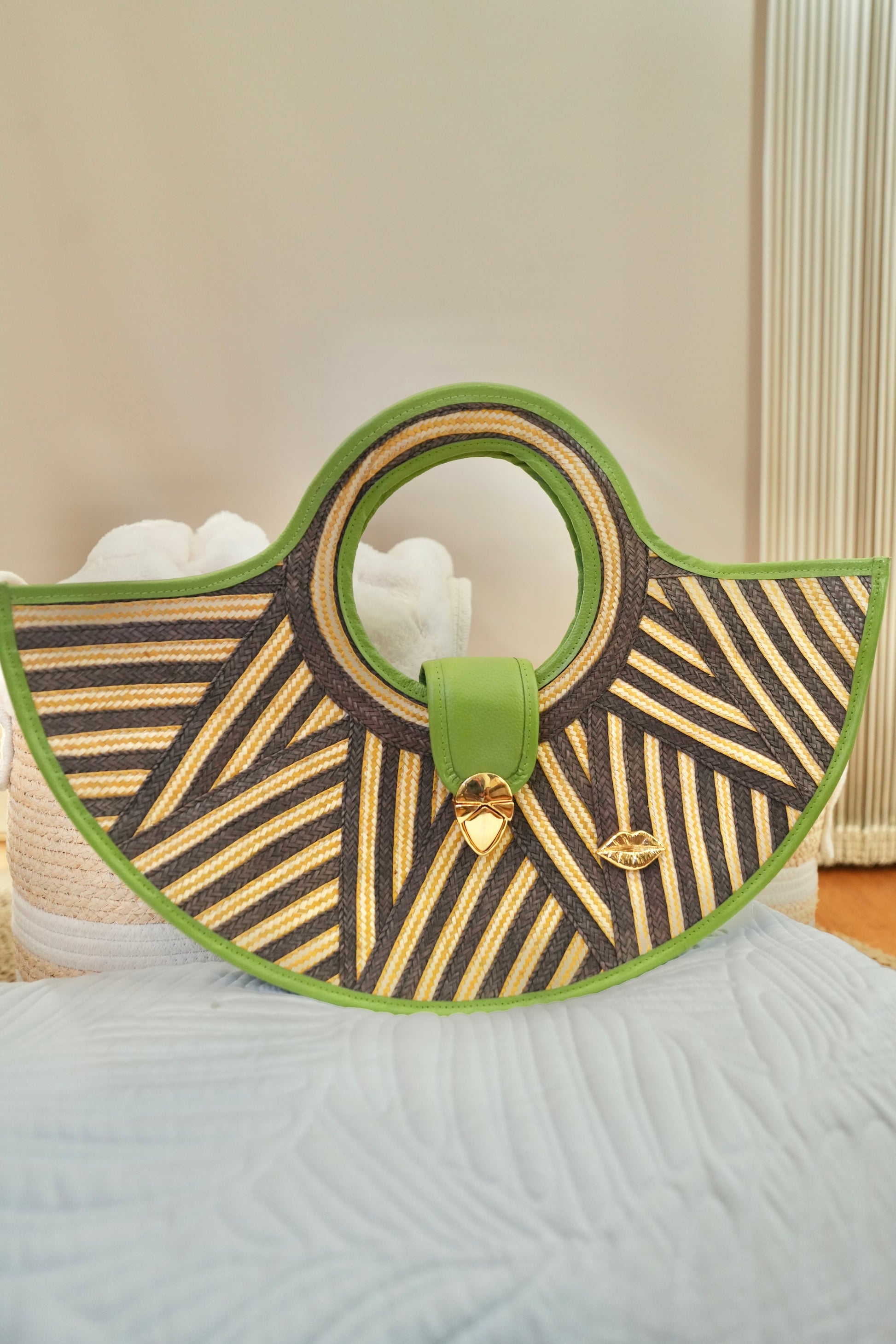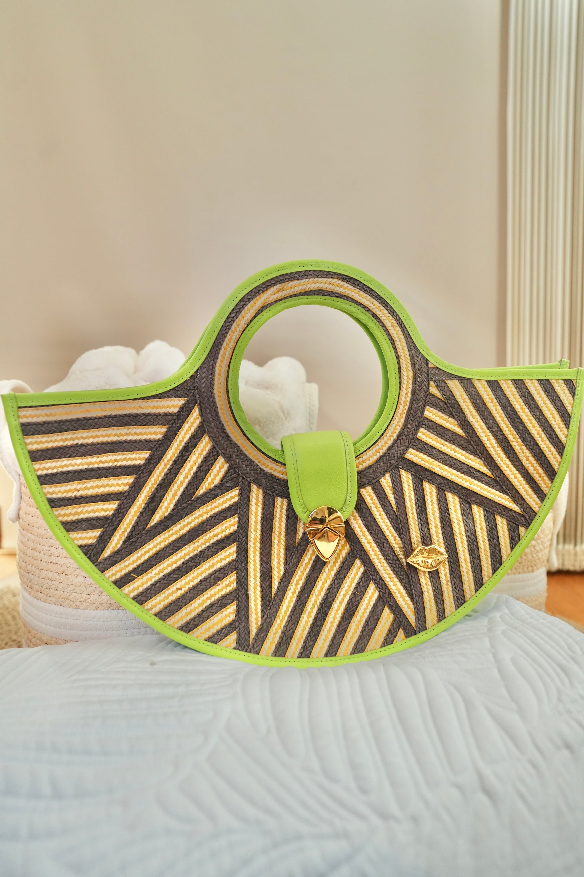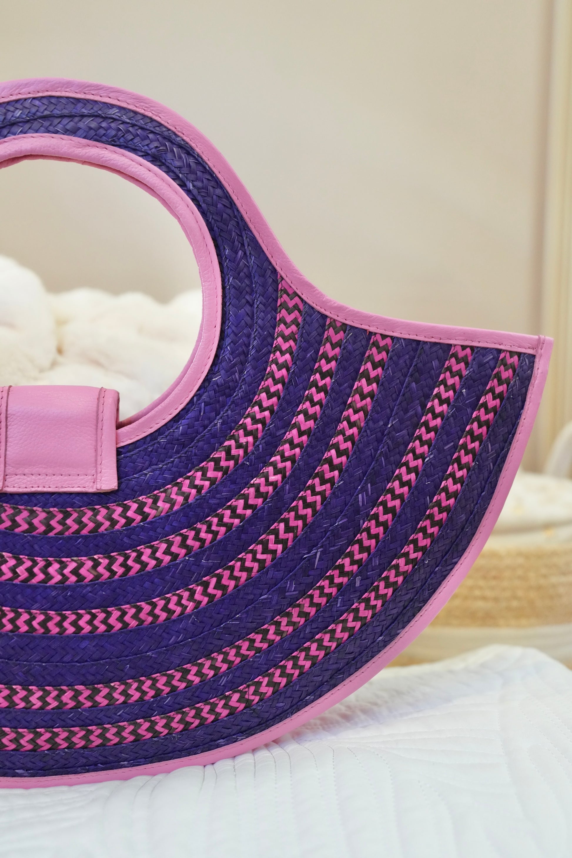 The geometric black and fuchsia contrast creates a modern, sophisticated visual effect, highlighted by gold hardware and the iconic Bluelips kiss.